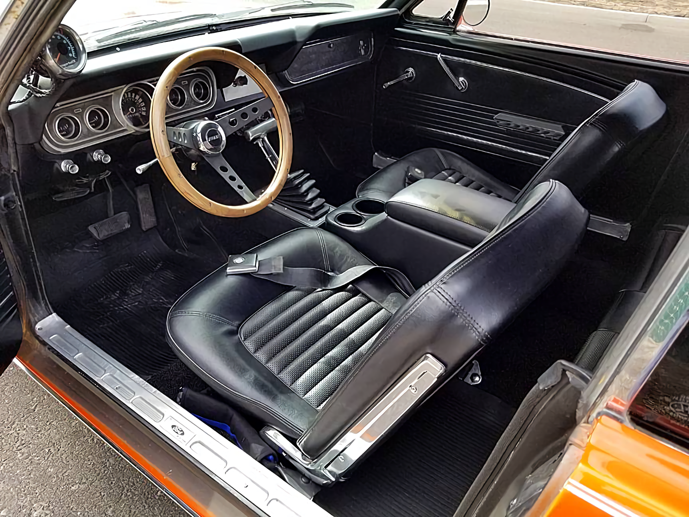With Grabber Orange paint, silver Shelby stripes, and a fiberglass Shelby hood with hood pins, this coupe certainly looks the part. The 17×8-inch American Racing Torq-Thrust 2 wheels and NASCAR-style side exhaust add to the high-performance posturing.