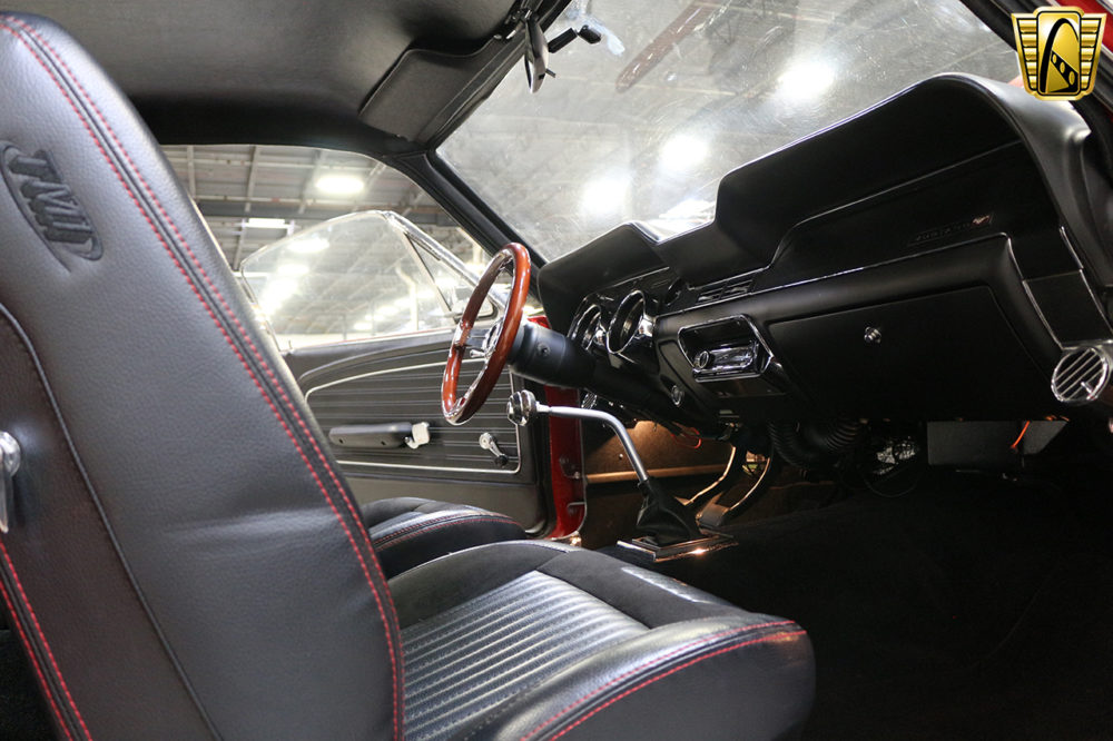 Exhaust gases escape through Hedman headers en route to a pair of Flowmaster mufflers. From the video posted on the dealer’s page, we can tell that this classic red fastback sounds as good as it looks.