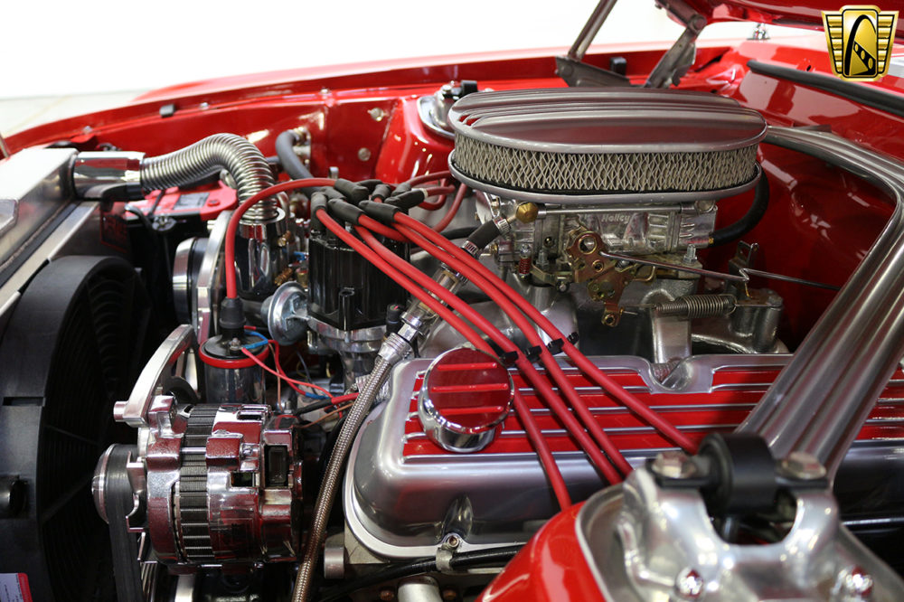 Under the hood, you’ll find a 408 cubic inch stroker motor, backed up by a fresh Borg-Warner T-5 manual transmission and a Ford 9 inch rear axle. The engine breathes through a 750cfm Holley four barrel carb sitting atop an Edelbrock intake.