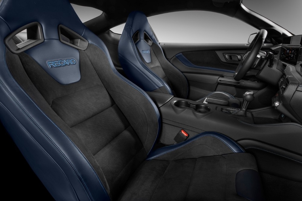 Of course, the Dark Horse distinctions don’t stop with the exterior. To match the track-focused performance bits, there’s a flat-bottom steering wheel wrapped in grippy suede, and contrasting Bright Indigo Blue stitching on the seats, shift boot, door panels, and center console. The optional Recaro buckets feature suede inserts, along with Deep Indigo Blue bolsters to keep you planted in the chairs during hard cornering. In another cool touch, the seat belts are also Deep Indigo Blue.