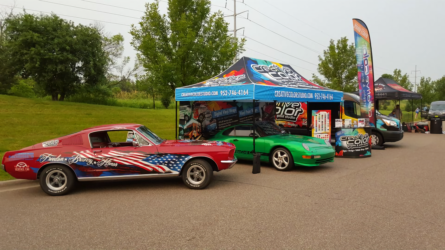 Morrie’s Heritage Car Connection, a classic car dealer and rental service in Golden Valley, Minnesota, ventured to find out. Back in 2015, they loaned a 1967 Ford Mustang Fastback to Creative Color Studios, who devised a full-vehicle, Ol’ Glory/John Hancock wrap to show off the full range of their capabilities at a local Fourth of July cruise-in.