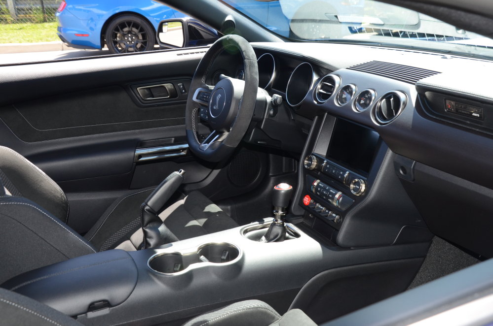 The newest GT350 has the same basic layout as the non-Shelby models, but the premium infotainment system with the big touchscreen is standard, as are the auxiliary performance switches, an oil pressure gauge, an oil temperature gauge, Recaro cloth bucket seats and a flat-bottom steering.