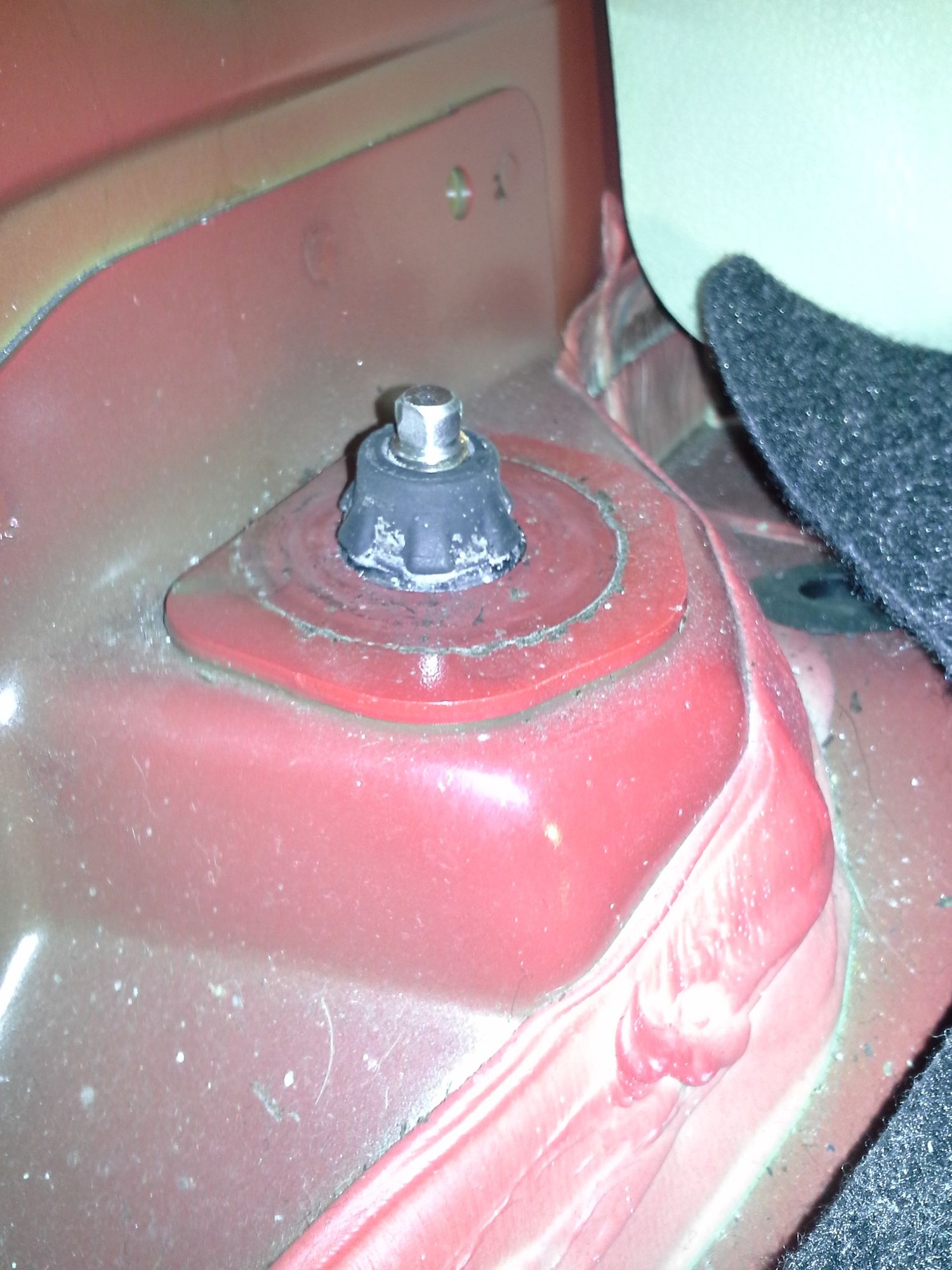 With the car on the ground the thread still did not show. I had to use pliers to pull the tip up and it took some effort that bushing is a tight fit! But I got just bareley enough thread to show to start the new nuts I got. Thanx again. I was replacing Gabrielle Ultras which were not from the factory, I think Ford uses motorcraft shocks from the factory. Anyway, the Konis are designed to use the nut from the factory shock. I bought a couple of nuts at Autozone that fit! Thanx dudes.