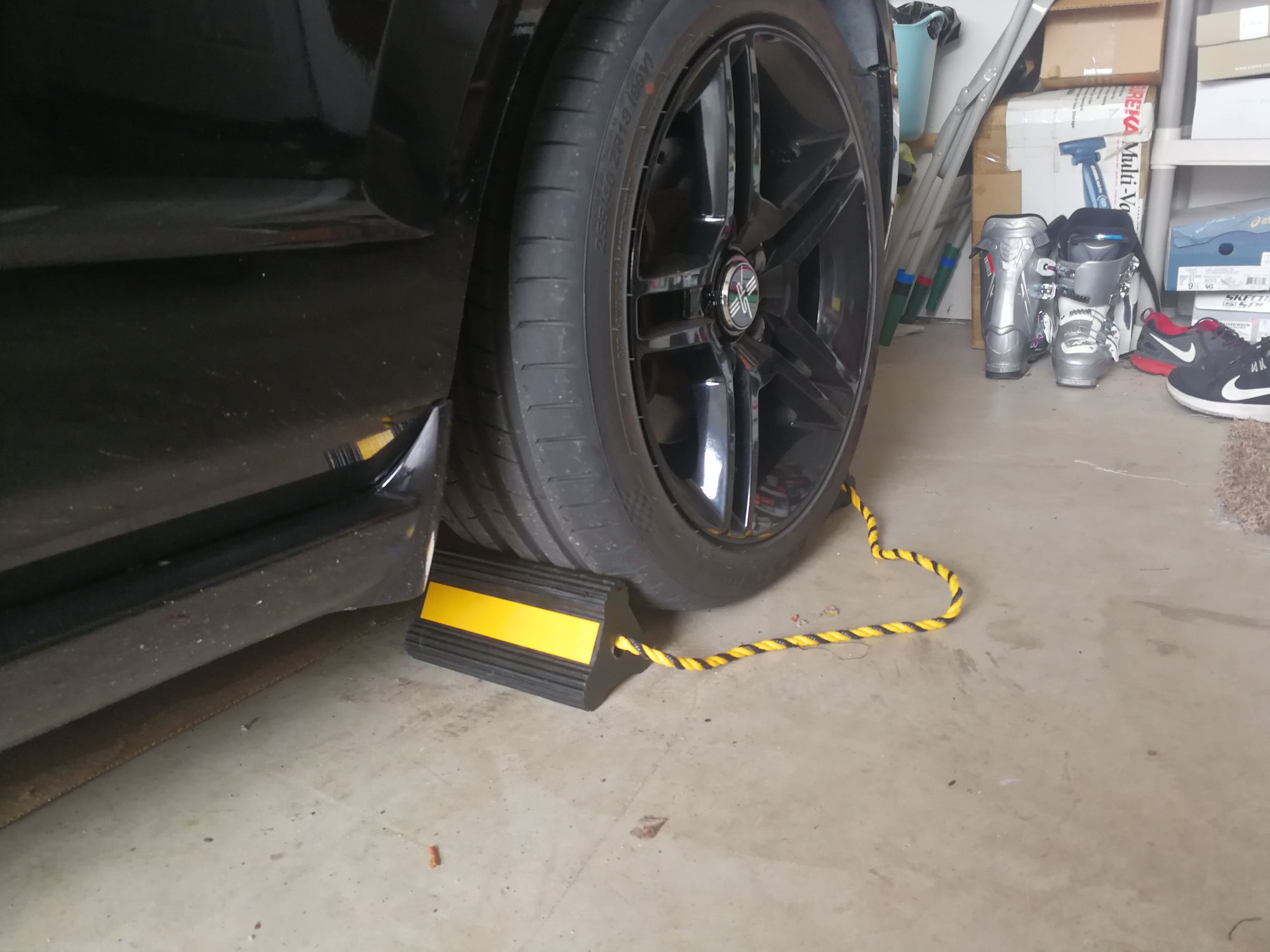 Chock your front wheel so it won't roll. We'll be jacking up the rear so having the car in gear or ebrake engaged won't do anything.