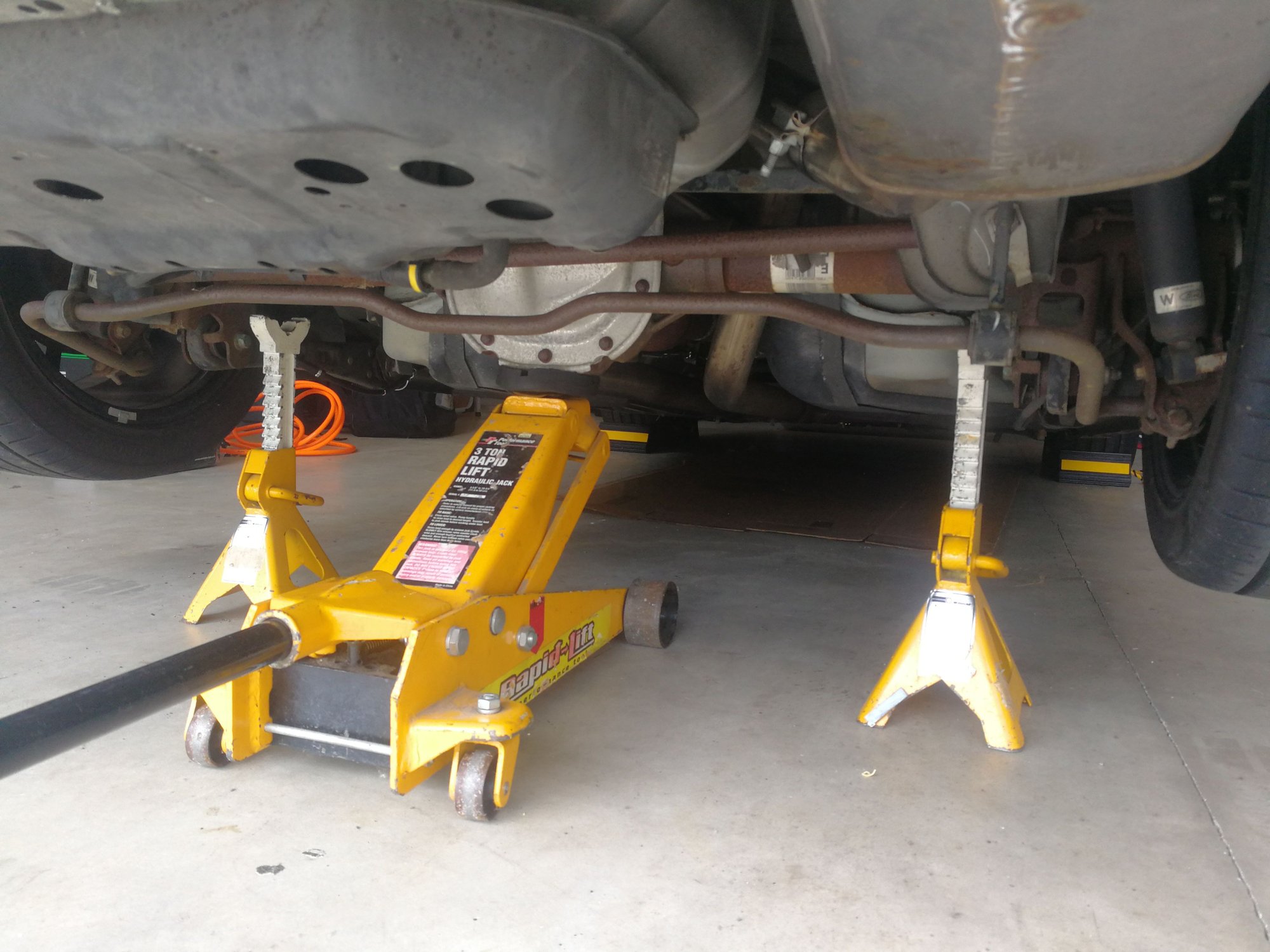 Jack your car up and put jack stands on your axle. I jacked it up the controversial way but you can do it on the designated jack points.