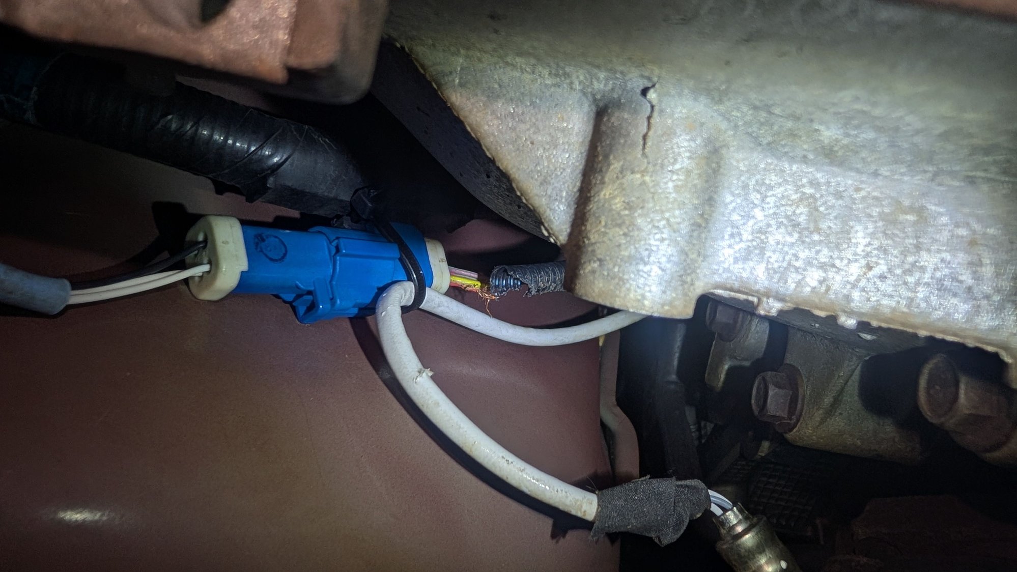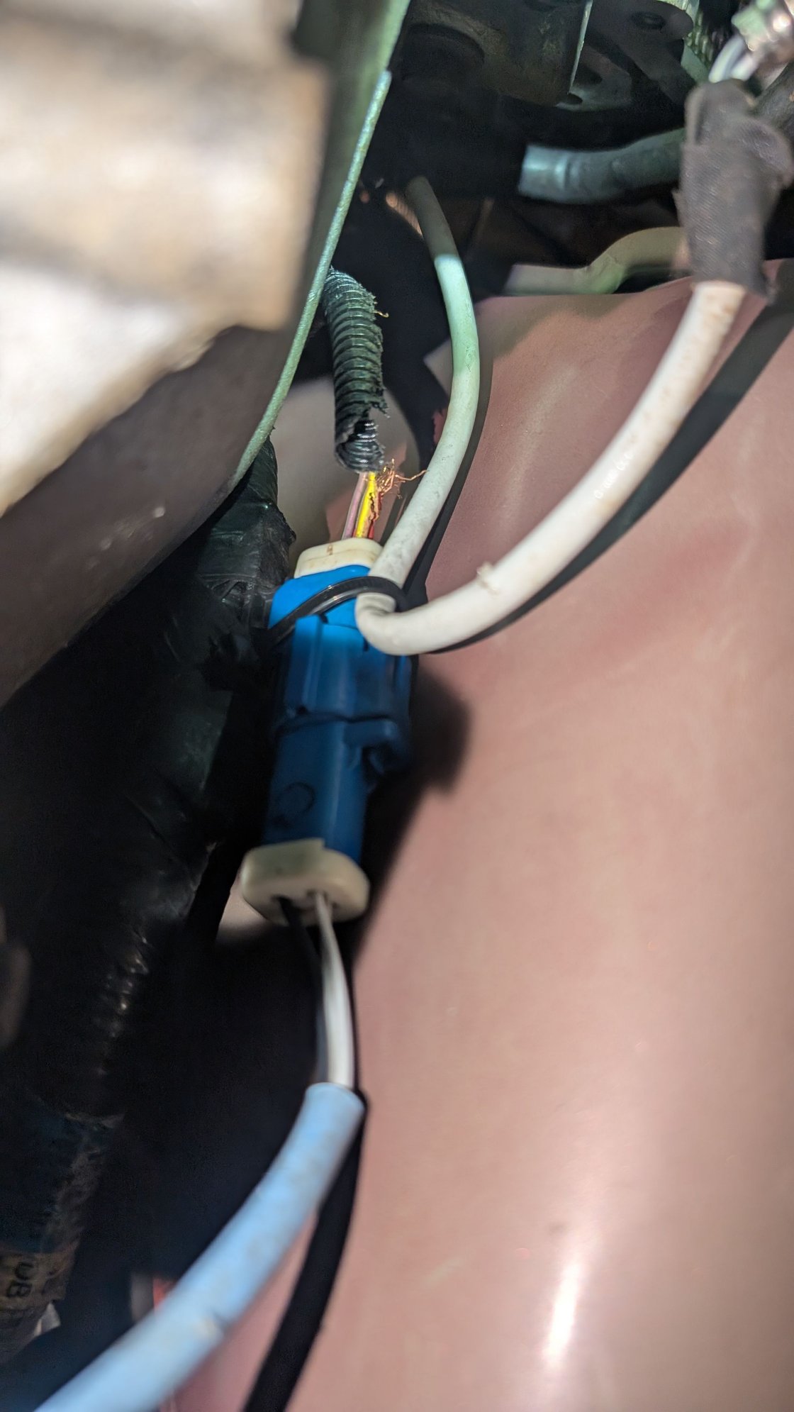 I'm considering trying to just disconnect the harness from the engine. Then maybe it will hang down enough to let me repair the broken wires with a crimping tool.