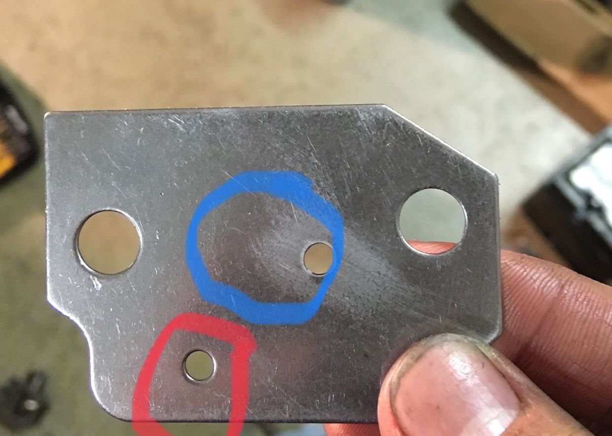 Blue is where the oil feed hole on the engine lines up and red is the original hole that was on the spacer, I removed both of my tensioners and neither were getting any oil, I feel pretty dumb for not putting it together in my mind the first time that those hole locations weren't gonna work
