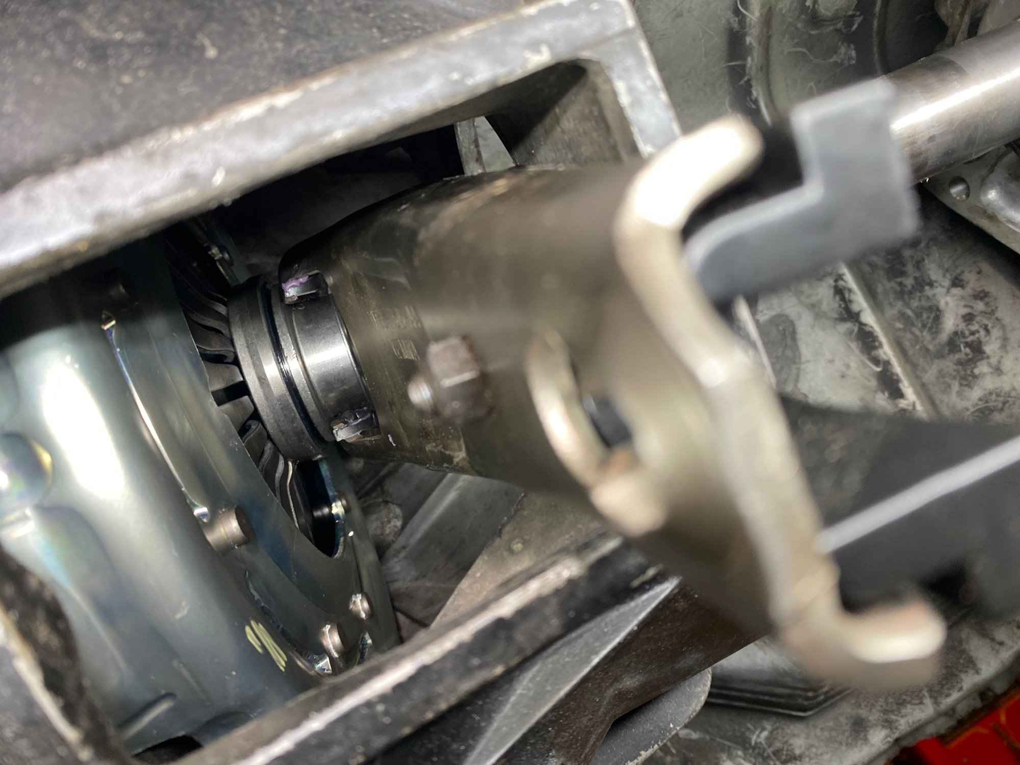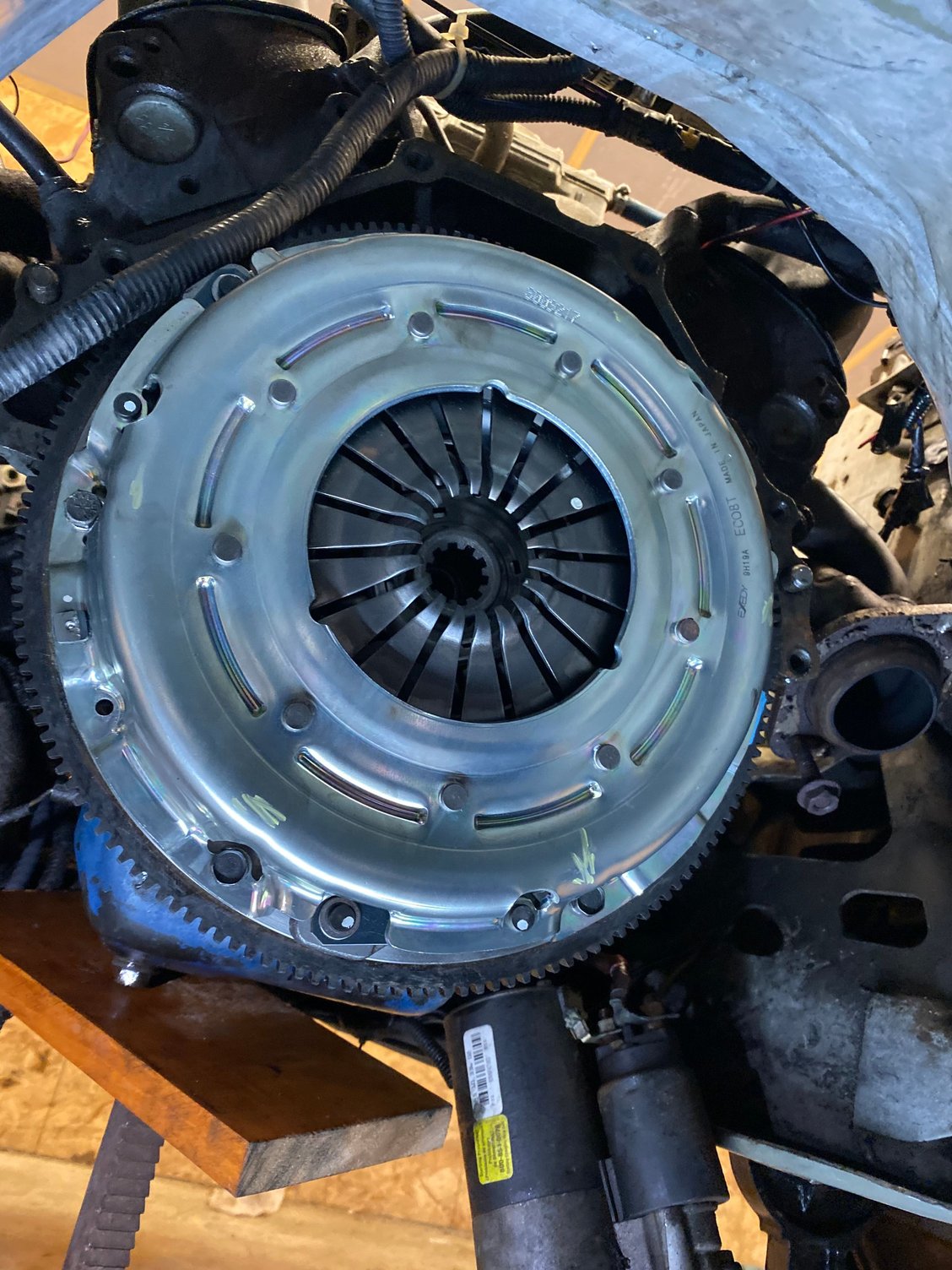 we know the clutch fork is engaging all the way, and we see the throw out bearing engaging into the pressure plate springs. And double checked before hand that we installed the clutch in the proper direction. And torqued everything to spec.