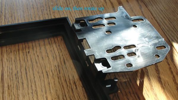 1) Start by putting the metra dash kit together and connecting it to the radio. Depending on the year, you may need to add some spacing tabs to the 'dash' part so it will fit flush when you put the radio into your car. There are side 'plates' that need to be installed onto the dash part, but depending on the year of your Mustang, you may have to remove the rear mounting tabs on the plates (I have a 2005 and removal of the tabs was necessary). Just use the Dremel with the cutting tool to cut the rear tabs off, leaving where they mount to the side plate intact: