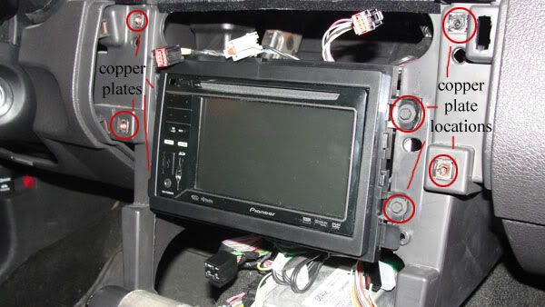 while the dash panels are off, it is a good time to 'fix' some potential rattles and vibrations some of you may have. You may have noticed some copper looking plates where you removed the screws that hold the trim; for me, those caused some of the vibration/rattle sounds my car makes. Fixing the problem is easy, too; simply take some electrical tape, and cover each copper plate before screwing the radio or any of the trim parts back.