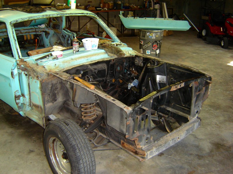 I'm getting ready to begin my winter project on my 68 coupe. I'm going to take apart the front end body panels, etc. and inspect/replace/repair anything needing bodywork. Is there an order to which things come off? Is there a book that describes this? Everything from the doors forward is coming off if possible. The fenders need repaired/replaced. The doors need reskinned or repaired. The hood needs resanded but looks to be in good shape. The bumper and pan under the bumper are in great shape. The infamous cowl is in bad shape. The shock towers have been replaced. The engine compartment looks good aside from a hole in each side where the fenders bold to the top. I need to inspect all other metal panels underneath. Should I be ok leaving the engine in?