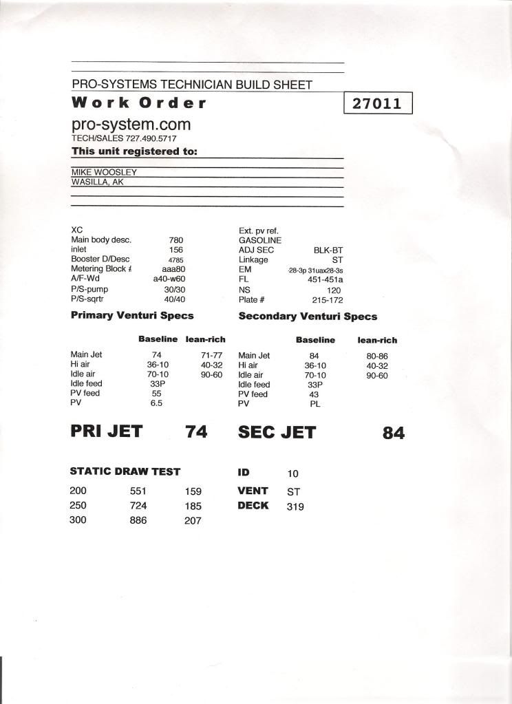 I've been following this thread now for a while. I just installed my ProSystems carb last week. I've been increasing my idle air bleeds since I cannot get the required minimum 1 1/2 turns out on the idle mixture screws. Bumping up my timing and going back to my larger blower pulley helped somewhat. At .070 I was at 1/2 turn out with 14ish readings at idle. I then went from .070 to .073 to .076 and can only get 3/4 turn out keeping my 14.6 reading at idle. I need to purchase more bits tomorrow before I can continue. I am heading in the right direction. Patrick recommends going .010 increases. My WOT is in the 13's. I'll be lucky if I can get by with just increasing my idle air bleeds. I am going about this kind of backwards. I have purchased a new Aeromotive fuel system and should install that before tweaking the 02. I just couldn't wait since that nice new shiny carb was just sitting there before all my AN fittings arrived. Attached are my carb specs and a great e-mail Patrick sent me for tuning the carb. I can honestly say, ProSystems has great customer service. I have emailed Patrick at least 4 times and he is very prompt with his replies.