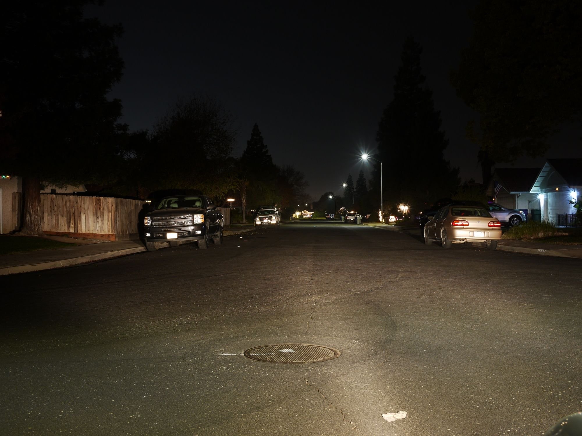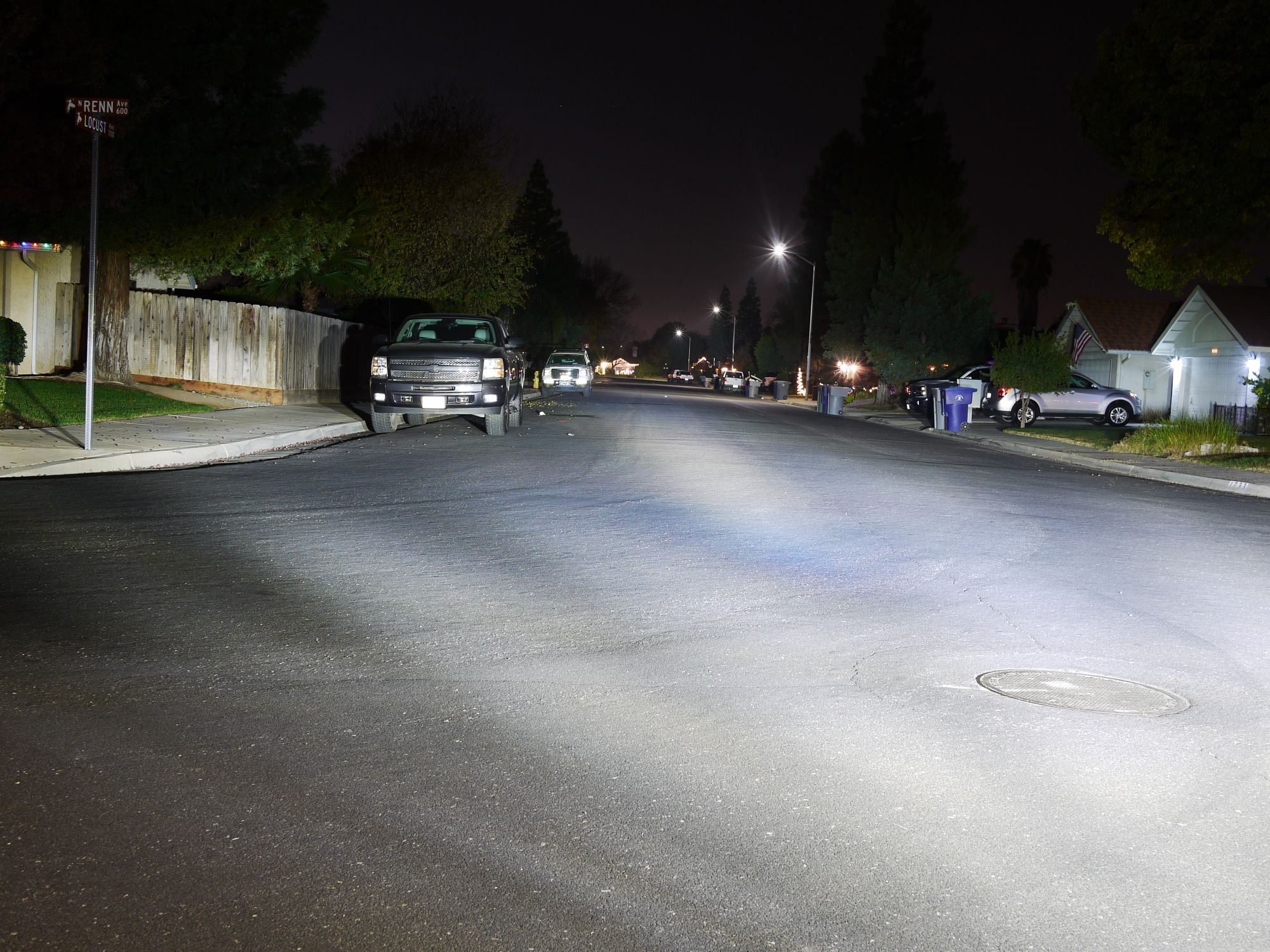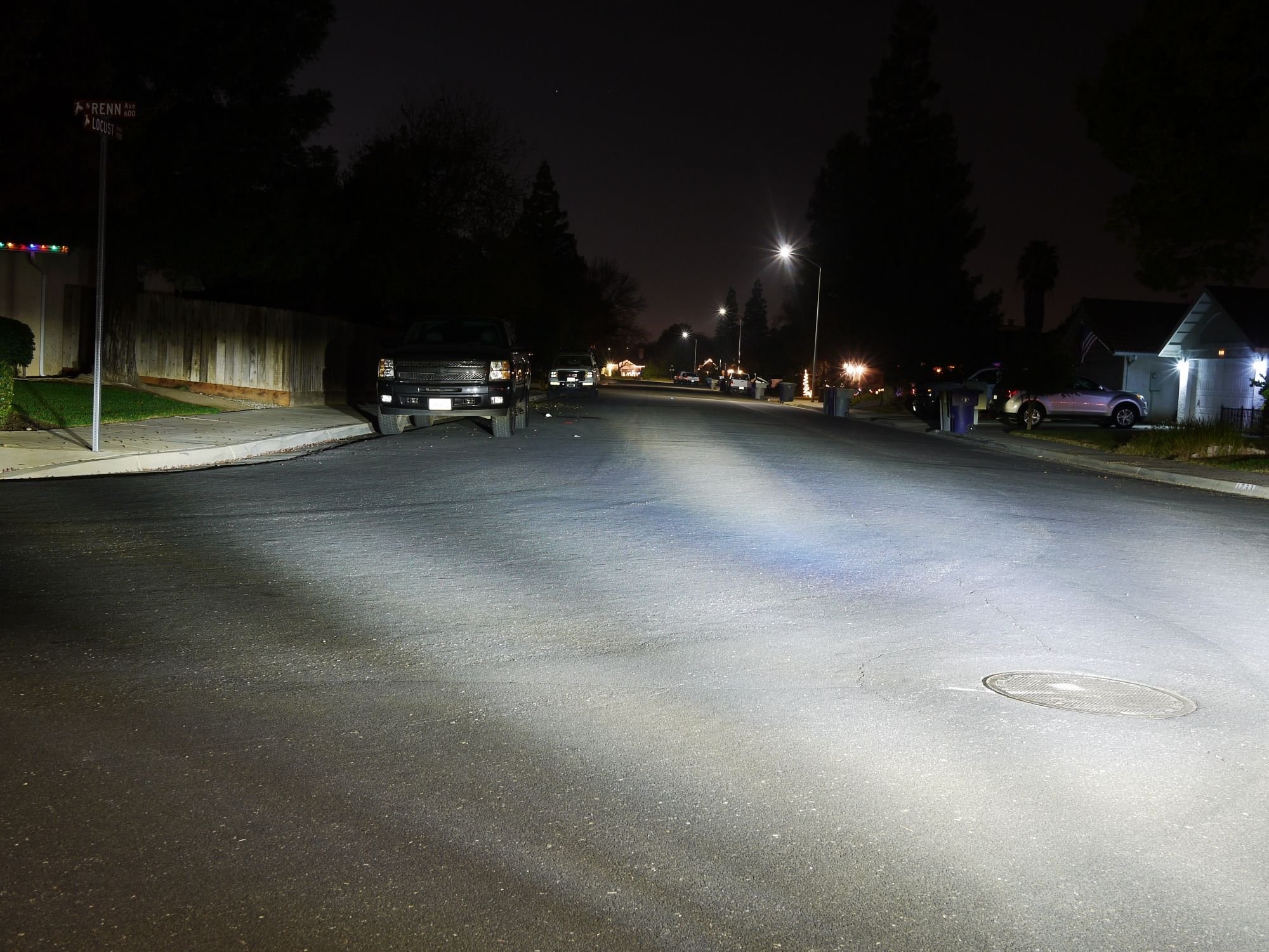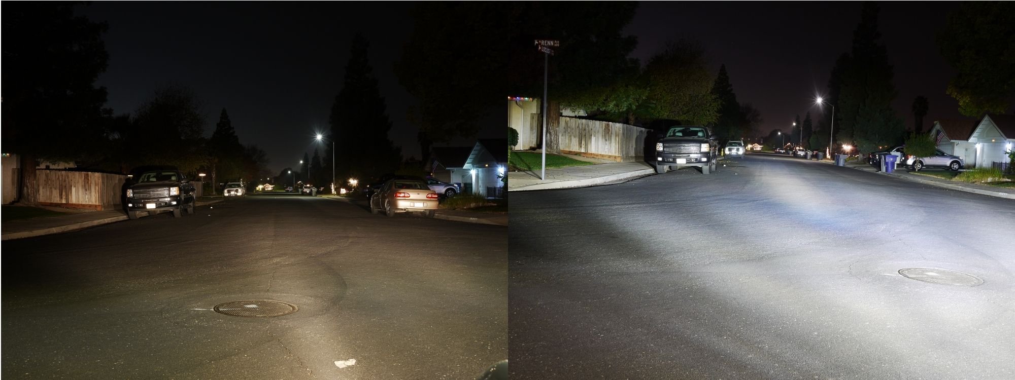 A now the comparison between the halogen and the LED on the same street. They are somewhat adjusted but not perfect all other conditions are nearly identical. This is with both LED headlights installed in the vehicle... The below image should be compared against image 1 (low beam halogen)