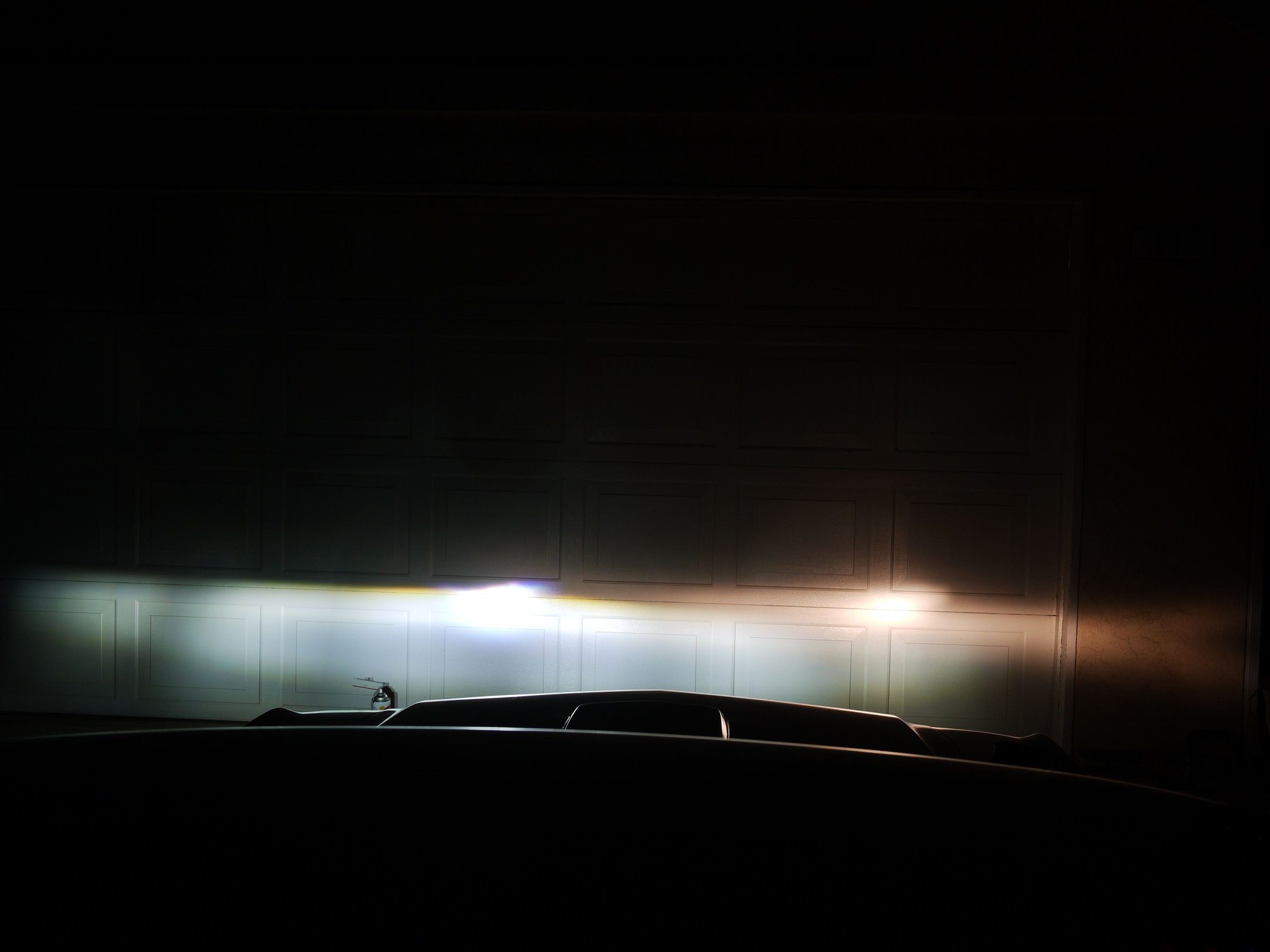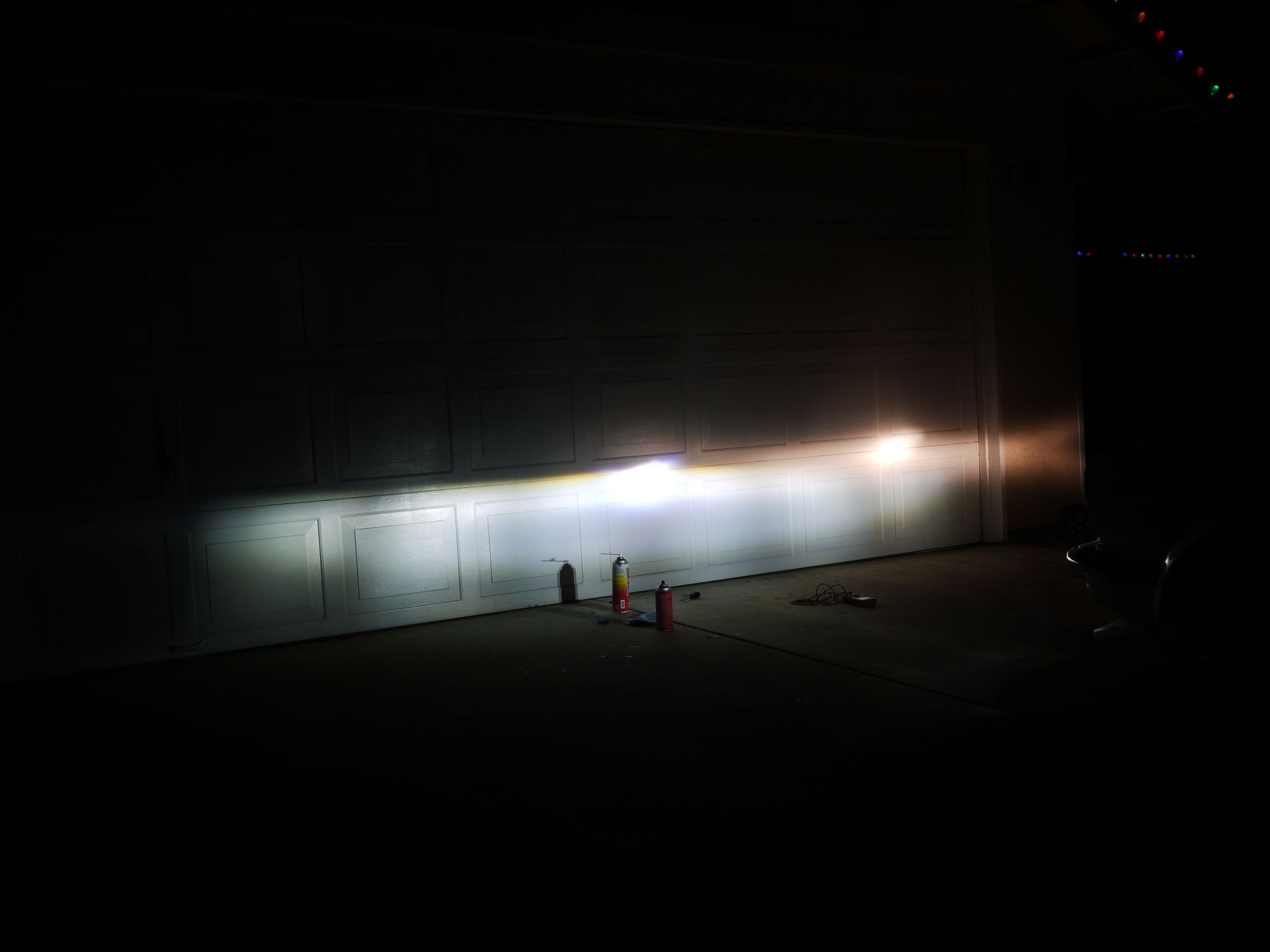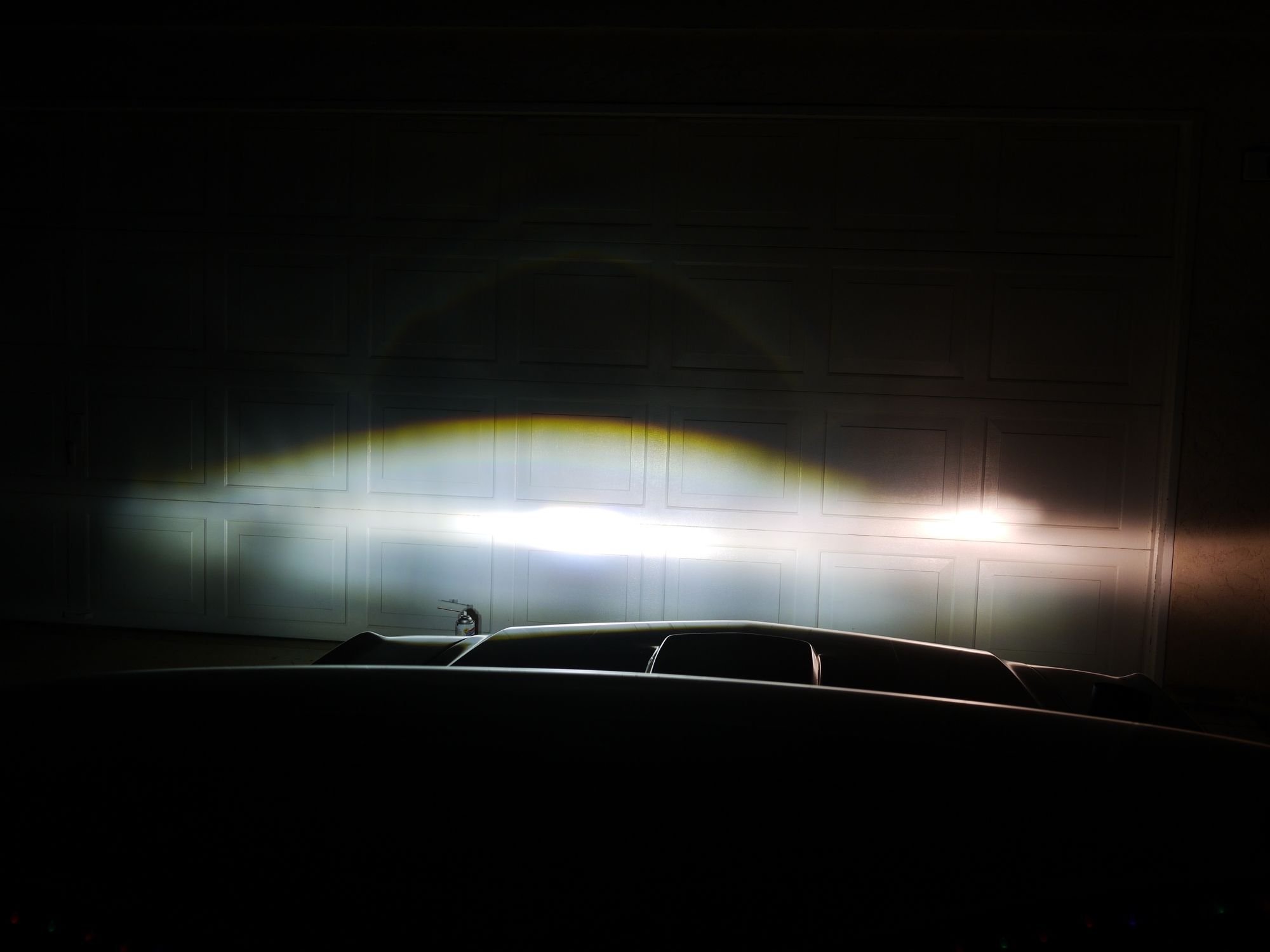 Engine not running at 11.4v shot dead center...This is a comparison of color between the two this is a very good representation of color. The LEDs are a very good white light very slightly blue. The garage door is white, This is low beam, The LED side is actually brighter than it appears by a small amount the center of the LED hotspot is over exposed and has pixel saturation (pixel is at max brightness value but true brightness is higher than its max value and cant be displayed) I should have set light metering for LED side and not halogen side but I was more concerned about showing color difference....It does a good job of that! Camera: F6.3, ISO 100, Shutter 1/10th sec