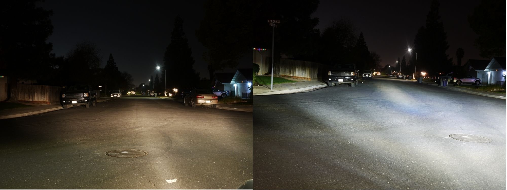 High beam side by side...The lights from the LED look more evenly diffused on the pavement in real life as well this also could be due to road crown and the slight nose high attitude of the car as it was on uneven ground. When driving around I dont recall them looking blotchy at all once adjusted proper. Could be due to CCD exposure vs the human eye as well....But again overall this is a good representation of light output.