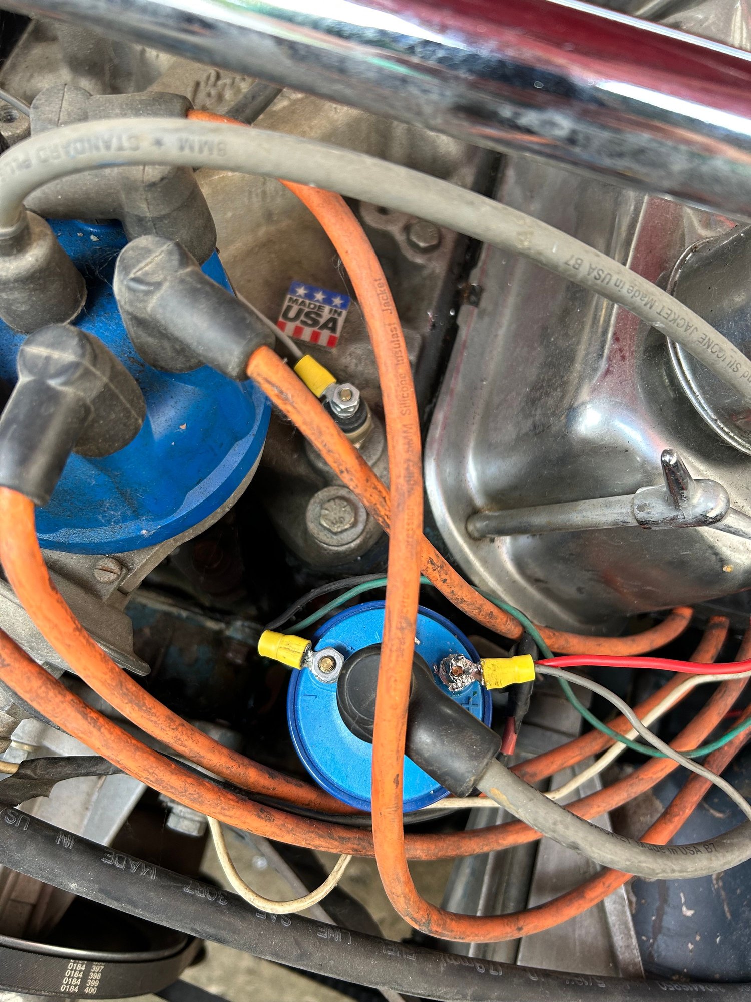 The black from the Negative runs to the distributor. Green from the Negative runs to the tach. The mess on the Positive is temporary solder.