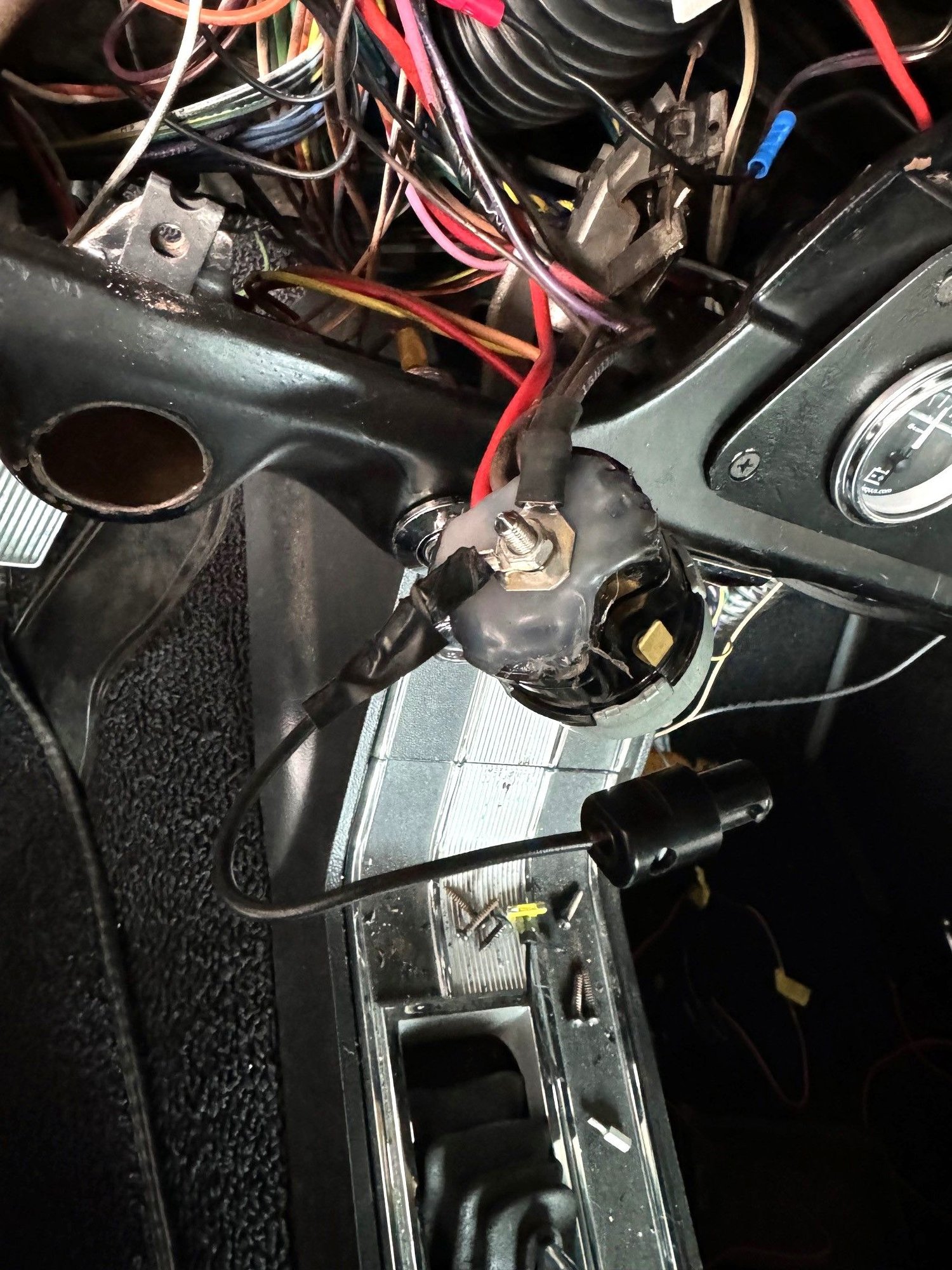 When I opened the dash I quickly found there was no power to the tach and could not trace where the shop had connected it because of a lot of tape. I moved that to the power stud on the back of the ignition switch and all was good. I had to move/extend some wires to get the gauges connected, particularly the two leads for the Amp gauge. When I cut the leads there was a small spark, forgot to disconnect the battery. When I got everything connected the Amp gauge was reading "12" with the ignition switch in the off position, when I disconnect a lead it went to zero. I tried the old gauge and it did the same thing. All other lighting works normally with the switches. When I tried to start the car the ignition switch did not activate the starter motor but all of the lights work. I used a large screwdriver to cross two studs on the solenoid and was able to start the car and it runs as normal.