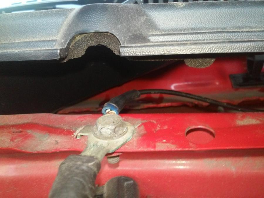 Does anyone have any idea what this loose wire is that is hanging near my battery? It hooks to a bolt going into the body and is part of another wire that then goes back inside the car to something. Somebody told me this is a ground wire for the EEC, and I need to connect a 14g or 16 wire to it and then connect it to the negative side of my battery. Something used to be connected there, because it has a blue splicer connected to it. After the wire leaves where it's connected to the body, it then leads down and around and there is another part that looks like a fuse holder and then continues onto inside the other maze of wires.