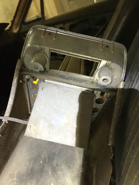 Figure 1. The parts I have for the console (radio bezel in back, notice the two tabs in place of the "sun-shade") Figure 2. A radio bezel I found in a 1968 convertible (no, I can't use it for this build as the convertible also needs this part). Note the attached "sun-shade" to the top of the part.