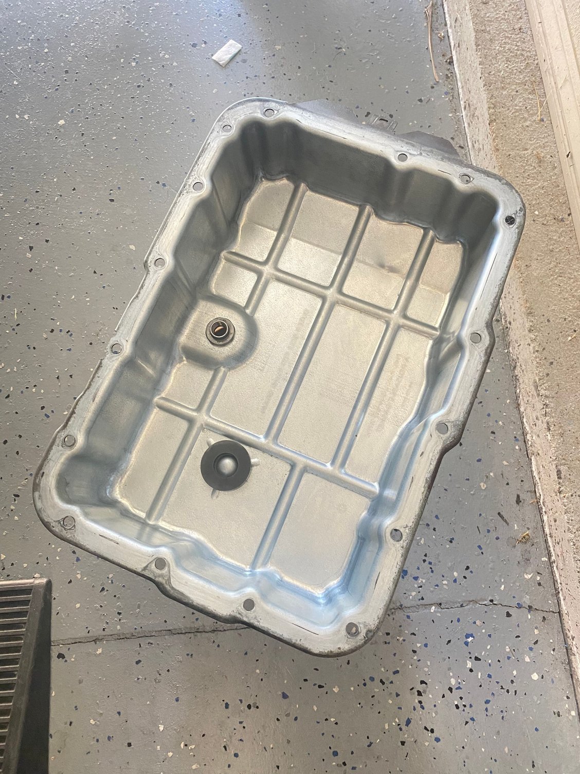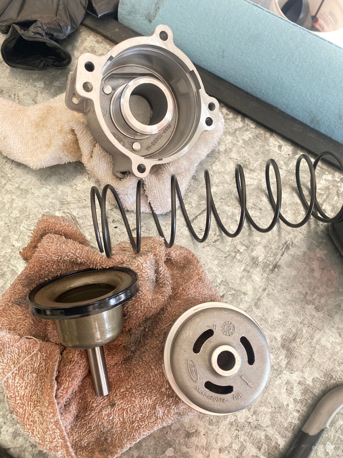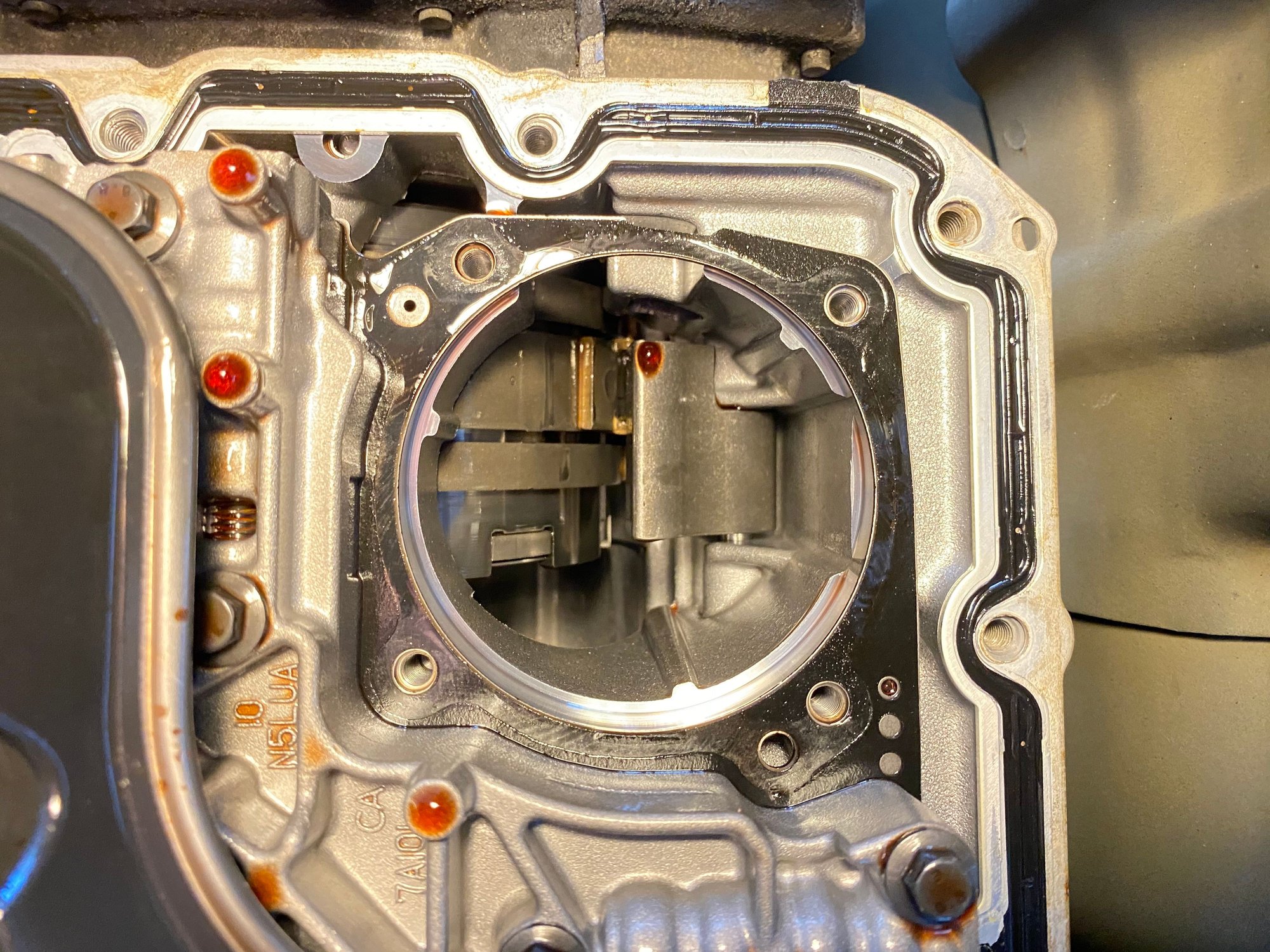 thought I’d do an update to help anyone who might be servicing their own 5R55S. Here’s a look from the rear. Reverse servo located on the right corner, closest to camera Cleaned out the pan and mating surface. A good twist in either direction will release the spring and open the servo housing assembly. Here are the big reverse servo components after cleaning. Here’s a look up after removing the reverse servo. I believe that is the reverse band with the other side damaged piece, although it is a mystery to me how the broken piece made its way into the pan—possibly a previous owner who put it in the pan as a “bread crumb” for whoever would try to service in the future. Haha!