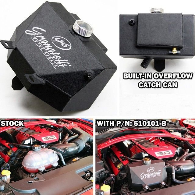 New for 2015 are the Granatelli Motor Sports S550 Mustang Coolant Surge Tanks (Part # 510100-P for Polished and #510100-B for Black Wrinkle) for all 2.3 EcoBoost, 3.7 V6, Mustang GT and Shelby GT350. This Unique Design Eliminates the unsightly bubble tank delivered from the factory. The Granatelli hand built 6061-T6 reservoir is a simple remove and replace installation using all factory hardware, you don’t even loose a drop of original coolant. All factory hose connections as well as the radiator cap are a direct cross over making installation no more than 10 minutes. The eye sore now nicknamed the “grenade” by several on the internet won’t win you any trophies in the engine compartment. The Granatelli unique design mimics the same taper and angle of the OE engine cover giving it a true stylized look while increasing capacity. Well-Suited with ALL Aftermarket Air Intake Systems. Show quality finished in either Powder Coated Black, Satin, or Mirror like Polished! Many People are Unaware, as delivered from Ford the factory surge tank can spew coolant on to the road surface making it unsafe for racing conditions. If competitive racing is in your future, Granatelli offers Part # 510101-P and #510101-B with Integrated NHRA and SCCA legal 1-pint Catch Can and Drain Petcock.