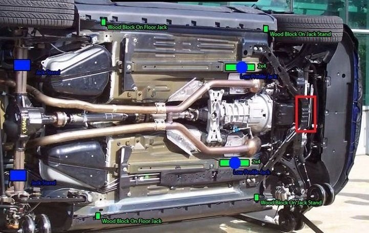 If you need the space, jack up the front end of your car. Place on jack stands in the approved locations. This is optional, but it helps if you need the space to work under your car.
