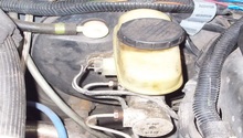 Open your hood and locate the brake fluid reservoir/master cylinder. Using your turkey baster, siphon out the old brake fluid. Pay attention and put a rag under you because brake fluid is corrosive to the paint.