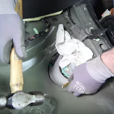 Use a flat screwdriver and unlock the fuel pump connector by pushing the red tab back and pulling the connector off. Then, remove the fuel line connector by pushing in the green tab and pulling back. Be prepared to catch some fuel that is trapped in the line. Now, the locking ring has to be spun counterclockwise to release the fuel pump from the gas tank. Use a hammer and a brass punch to spin the locking ring as shown in Figure 7.
