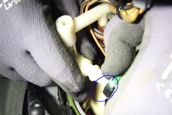 Thoroughly clean the area around the fuel pump before removal to ensure no dirt gets in the fuel tank. Now, carefully pull up on the fuel pump but do not remove all of the way, as the crossover fuel line tube is still connected. This is removed in the same fashion as the fuel line on top of the fuel pump. The location of this tube is in Figure 8. Now, the fuel pump is ready to come out. Be careful as you maneuver it out and be ready to catch some fuel that is on the fuel pump body.