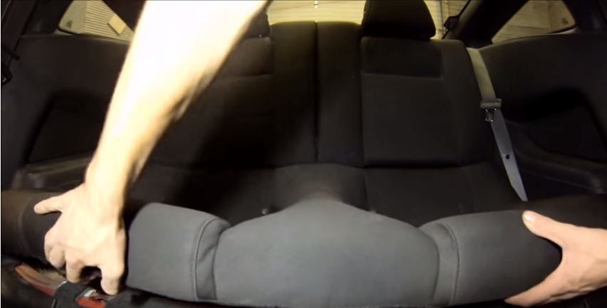 - Once they are lifted, you will feel a clip underneath the center of each seat. Push the tab in and pop the seat off.
