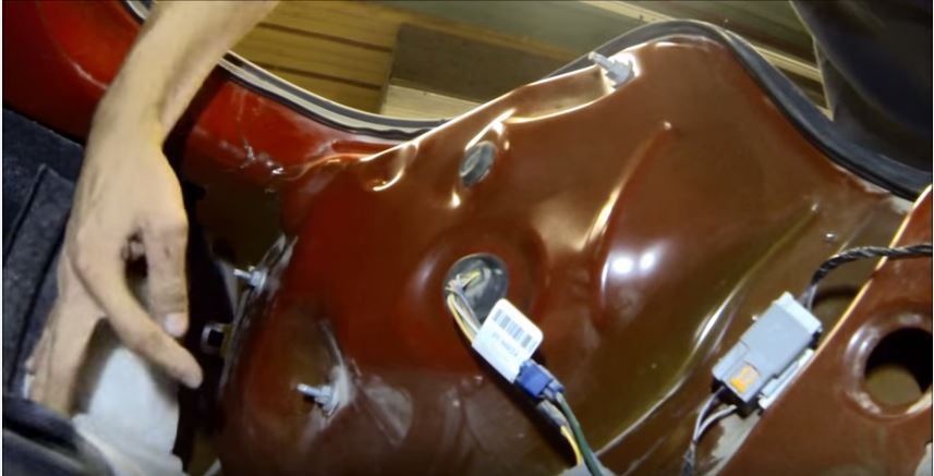 - Inside of the trunk, run your camera connector wire through the grommet in the tail light cavity.