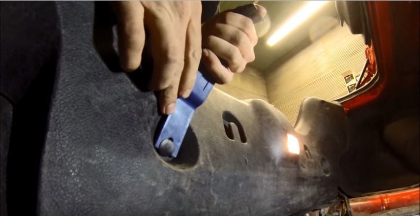 - Once you are at the center point of the rear seats, slide a pry bar under the carpet to the front edge of the center console.