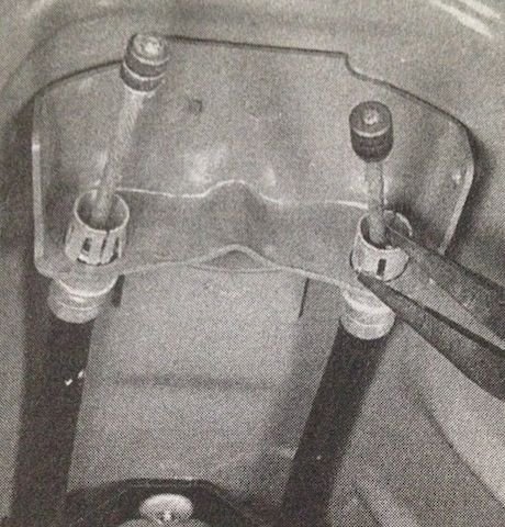 There are two brackets that hold the rear cables in place. There is one on the lower suspension arm and one on the underside of the pan. Remove the bolts that secure the brackets in place.